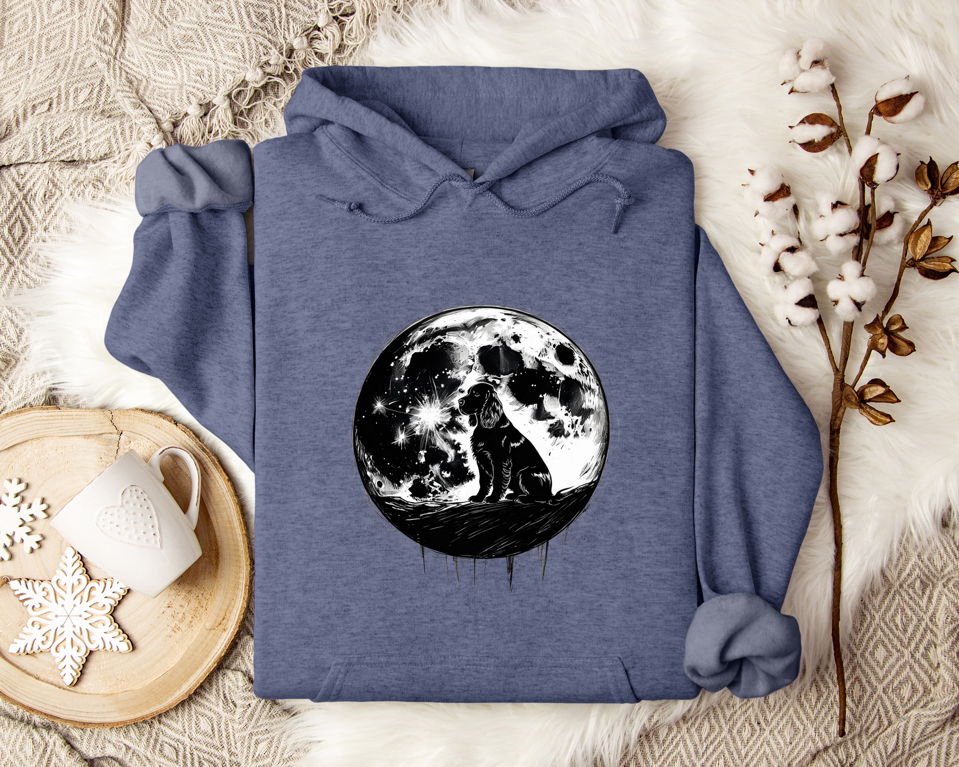 The Moonlit Dog Hoodie celebrates the bond between loyalty and the night sky. Featuring a dog gazing into the glowing full moon, this hoodie is perfect for dog lovers who also adore celestial aesthetics.